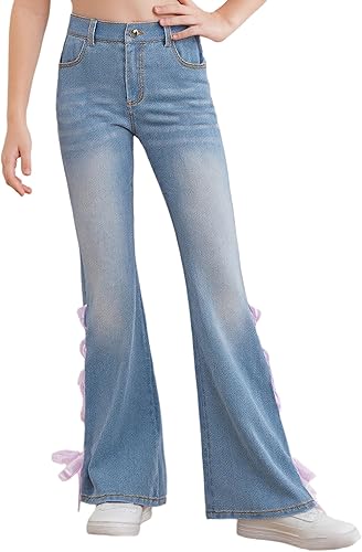 Aislor Kids Girls Flare Bell Bottom Jeans Cute Y2k Bow Denim Pants Casual High Waisted Denim Trousers with Pockets