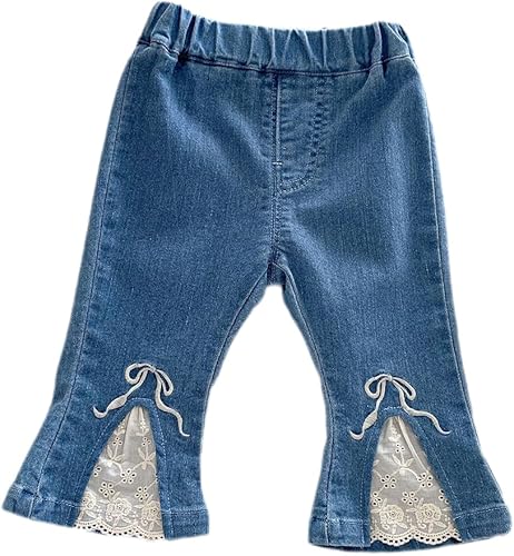 Girls Bow Pull on Jeans Elastic Waist Wide Leg Flare Denim Pants with Pockets Kids Toddler Cropped Washed Trousers