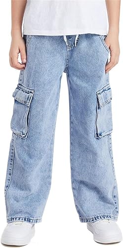 Kids Girls Elastic Waist Baggy Cargo Denim Jeans Pants with Pockets - Y2K Wide Leg Cotton Casual Jeans for 4-14Years