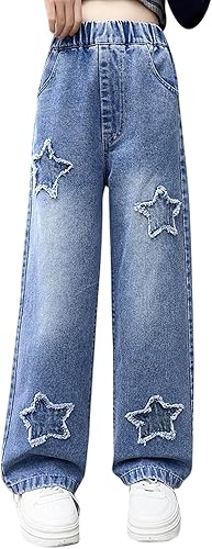 Baggy Star Jeans for Kids Girls Wide Leg Straight Elastic High Waisted,Y2k Casual Denim Pants Daily Wear Streetwear