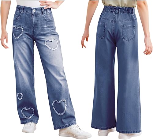 Girls Baggy Jeans Love Heart Embroidery Straight Wide Leg Denim Pants Teen Y2k Elastic Waist Casual Loose Trousers
