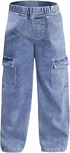 Baggy Cargo Jeans for Girls Wide Leg Streetwear Denim Pants Kids Y2k Stylish High Waist Trousers with Multi Pockets