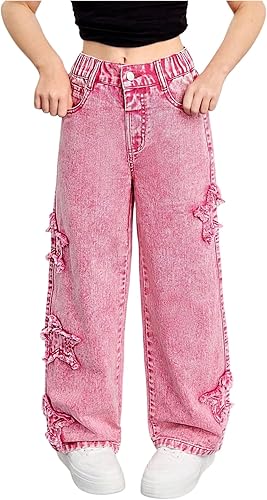 Girls Ripped Wide Leg Jeans Baggy High Waist Stretch Y2K Straight Denim Pants Palazzo Loose Pink Raw Cute Fall Bottom