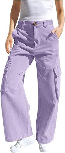 Kids Girls Baggy Cargo Pants Solid Color Loose Wide Leg High Waist Casual Pants Fashion Relaxed Trousers with Pockets