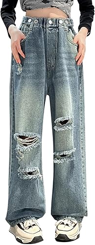 Girls Ripped Straight Jeans Streetwear Baggy Wide Leg Denim Pants with Pockets High Elastic Waist Hole Washed Trousers