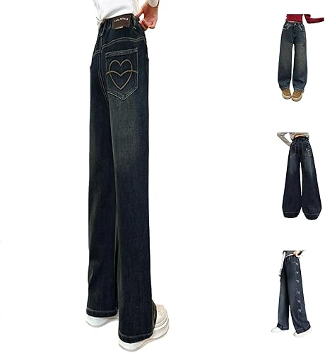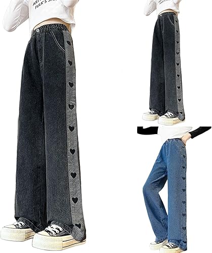 Girls Baggy Jeans Heart Graphic Straight Wide Leg Denim Pants Fall High Elastic Waist Distressed Y2K Streetwear