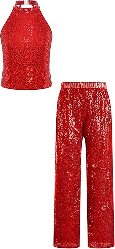 JEATHA Kids Girls 2-Piece Hip Hop Dance Outfits Shiny Sequins Sleeveless Halter Neck Crop Tops with Pants Set