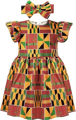 Haysandy 2 Pcs African Toddler Girl Dashiki Ankara Outfit African Dashiki Dress Headband Set Print Summer Party Clothes