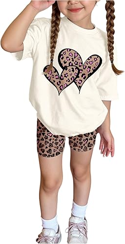 Verdusa Toddler Girl's 2 Piece Heart Leopard Print Outfits Short Sleeve Tee Top and Biker Shorts Set