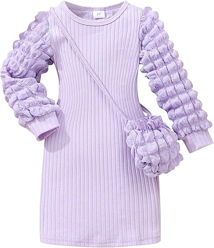 Little Girls Lantern Ruffle Long Sleeve Knit Mini Bodycorn Dress with Cute Bag for Special Casual and Party Wear