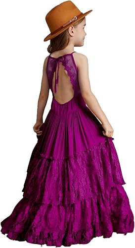 Girls Kids Lace Back Full-Length Backless Tulle Party Holiday Flower Girl Dress Size 4-14