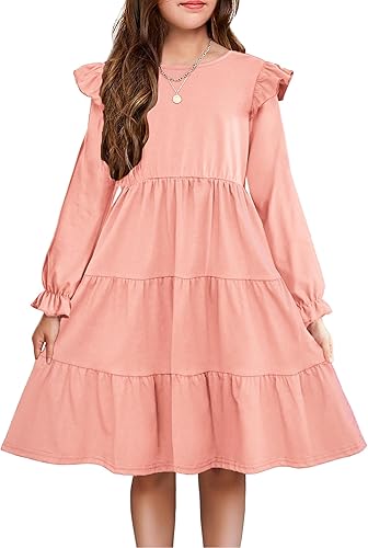 Arshiner Girls Dress Fall Ruffle Sleeve Tiered Flared Flowy Midi Dresses with Pockets