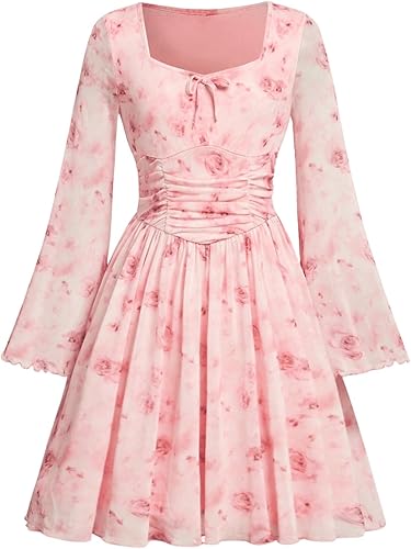 Verdusa Girl's Floral Mesh Boho Dresses Long Sleeve Ruched A Line Flowy Dress Spring Fall Clothes