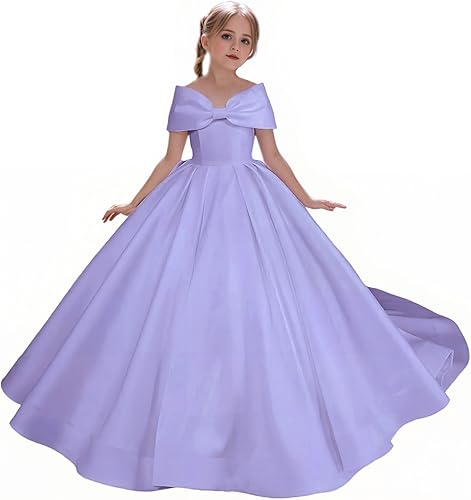 Off Shoulder Flower Girl Dresses for Wedding Satin Princess Pageant Dress First Communion Ball Gown with Bow