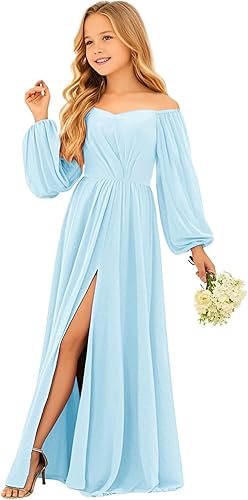 Long Sleeve Chiffon Junior Bridesmaid Dresses Off Shoulder Flower Girl Dress A Line Girls Formal Party Dress Slit