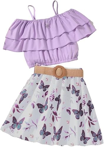 Girl's 2 Pieces Outfits Spaghetti Purple Layered Crop Top and Butterfly Print Skirt Set with Belt 7-13 Years