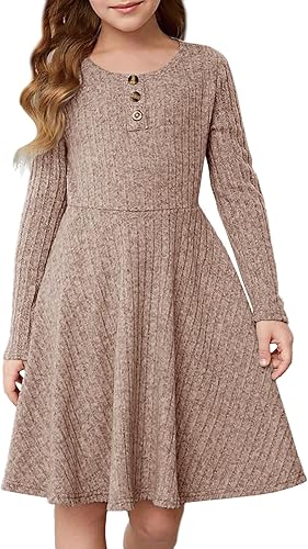 YOVION Girls Fall Long Sleeve Crew Neck Button Down Casual Flared A-Line Ribbed Knit Dress with Pockets for 6-12 Y