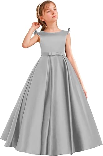 Satin Flower Girl Dress Crewneck Princess Pageant Dresses for Girls Sleeveless Prom Ball Gowns with Bow-Knot