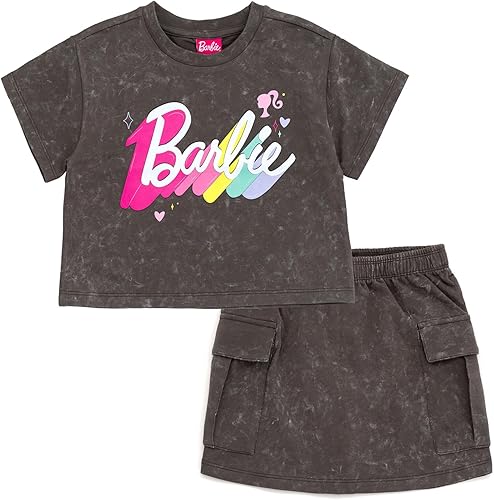 Barbie Girls French Terry Cropped Drop Shoulder T-Shirt and Skirt Outfit Set Toddler to Big Kid Sizes (2T - 14-16)