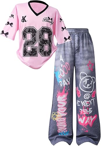 Girl's 2 Piece Outfit Graphic Number Y2K Jersey Shirts and Wide Leg Pants Sets Streetwear