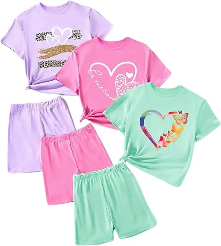 Girl's 3 Pack Summer Outfits Cute Heart Graphic Crewneck T Shirt and Shorts Clothing Set