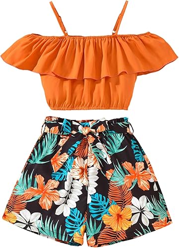 SweatyRocks Girl's 2 Piece Outfit Ruffle Cold Shoulder Cami Top and Tropical Shorts Clothing Set