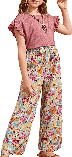 Floerns Girls 2 Piece Outfit Twist Hem Tee Shirt and Flare Leg Pants Set