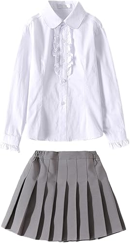 Girls Uniform Outfits White Blouse Button Down Shirts Tops and Pleated Skirt