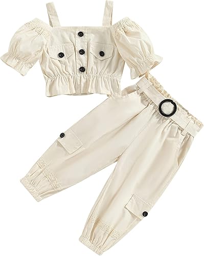 Little Girl's Summer One Shoulder Suspenders Ruffle Lace Crop Top and Trousers Solid Color Two Piece Outfits Set