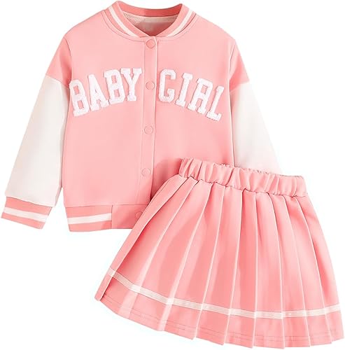 2-7T Toddler Little Girl 2PC Outfit Letter Embroidered Bomber Jacket & Pleated Skirt Set Preppy Sweatshirt Button Up