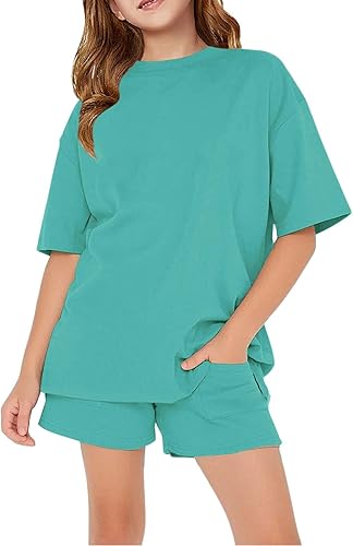 Girls Summer 2 Piece Outfits Kids Oversized T Shirts and Shorts Clothing Sets Matching Workout Set Activewear Trendy Outfits