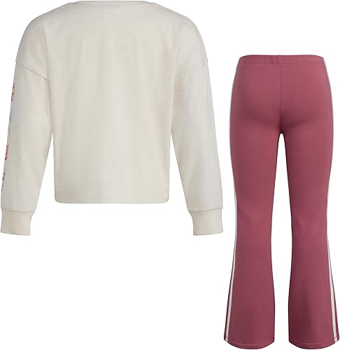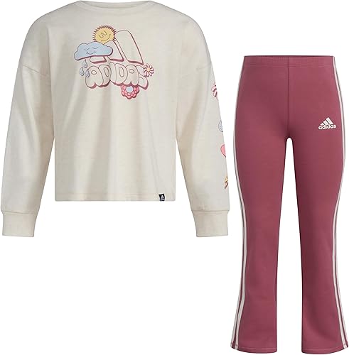 adidas Girls' 2-Piece Long Sleeve Graphic Tee & Flare Pant Set, Oatmeal Heather Pink, 3T