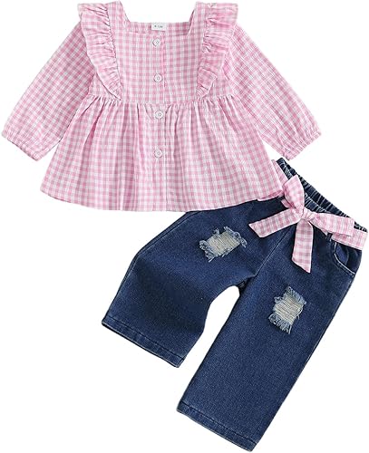 ZAXARRA Toddler Girl Cute Outfits Long Sleeve Plaid Print Smocked Tops Flare Pants Set Kids Fall Winter Clothes