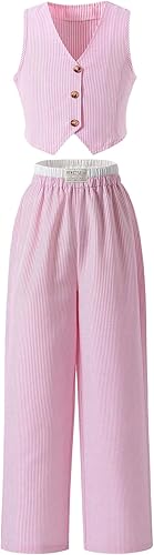 Floerns Girl's 2 Piece Outfits Elegant Striped Sleeveless Suit Vest & Long Elastic Casual Pants Set