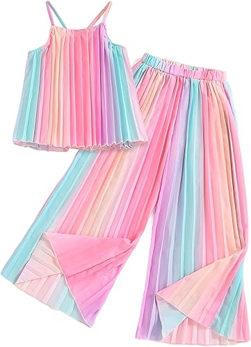 Hilinker Girls Rainbow Pleated Cami Top and Wide Leg Pants Set Cute 2 Piece Summer Outfits