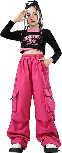 LOLANTA Girls Hip Hop Dance Clothes 2 Piece Outfits Jazz Team Long Sleeve Crop Top Cargo Pants Set
