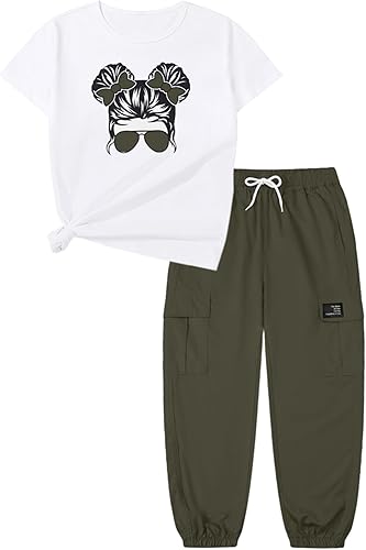 Betusline 2 Piece Clothes Set For Girls,Cute Short Sleeve Printed Tops and Cargo Jogger Pants Summer Clothes Set,4T-14Years