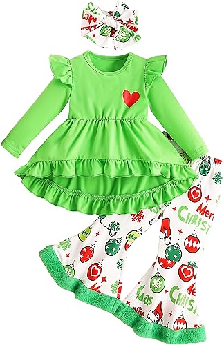 Toddler Girl Christmas Outfit Tunic Ruffle Long Sleeve Tops+Bell Bottom Pants+Headband 3 Pcs Clothes Set 2-7T