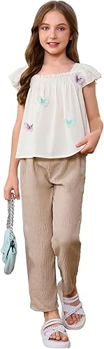 OYOANGLE Girl's 2 Pieces Summer Outfits Butterfly Print Ruffle Short Sleeve Blouse and Wide Leg Loose Pants Sets