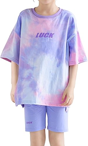 Happy Cherry Girls Summer Outfits 2 Piece Cute Teen Clothes Tie Dye Drop Shoulder Shirt Kids Biker Short Sets 7-16Y Clothing