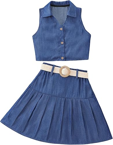 OYOANGLE Girl's 2 Piece Outfits Sleeveless Button Down Shirt Crop Top and Pleated Skirt Sets