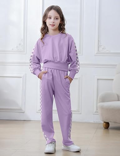 Kids Sweatsuit 2 Piece Outfits Girls Fashion Crop Long Sleeve Sweatshirts and Sweatpants (Purple,11-12 Years)