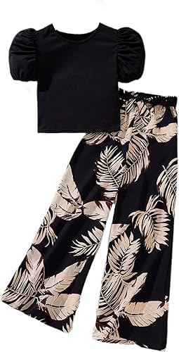 Floerns Girl's 2 Piece Outfit Puff Sleeve Round Neck Top and Tropical Print Belted Elastic High Waist Pants Sets
