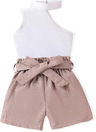 Toddler Kid Girl Asymmetrical Neck Sleeveless Tank Top and Paperbag Waist Belted Girl's 2 Piece Outfit Set