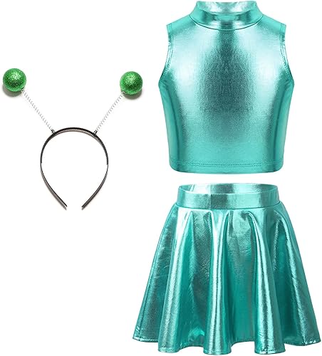Yartina Grls 3 Piece Dance Sports Suit Metallic Crop Tank Tops with SKirts Hair Hoop Set for Stage Party