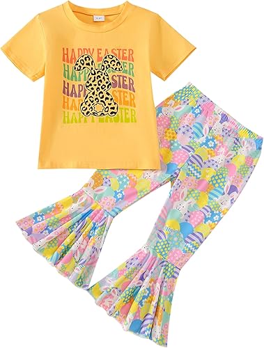 Girl Easter Outfit Short Sleeve Bunny T-Shir+Flared Bell Bottom Pants Easter Clothes