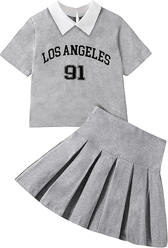 Girls 2 Piece Outifit Short Sleeve Graphic Top Polo Shirt and Pleated Skirt Set