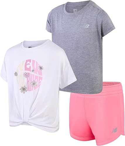 New Balance Girls Short Set - 3 Piece Short Sleeve Athletic Graphic Tee and Fleece Active Shorts for Girls (Sizes: 7-12)