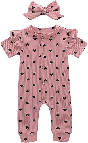Kids Cute Outfits Set Girls Hearts Ruffles Romper Baby Infant Girls Valentine's Day Print Jumpsuit Headbands Set