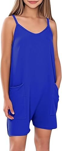 Girls Summer Sleeveless Casual Romper Cute Spaghetti Strap Rompers Soft Short Jumpsuit with Pockets for 5-13 Year